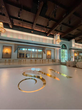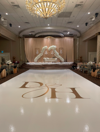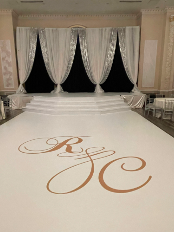 Stunning white monogram floor to make your reception truly unforgettable. Durable, high-quality vinyl design adds a personalized, luxury touch to your wedding dance floor.
